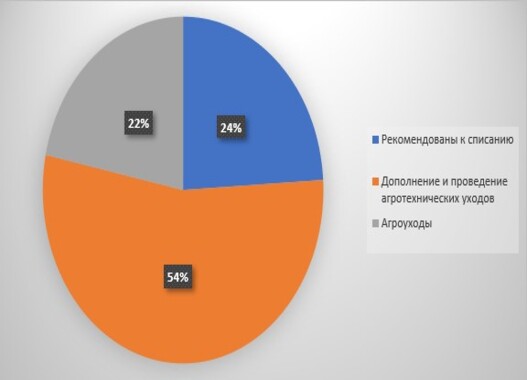 По результатам обследования даны рекомендации на площади 180,6338 га, из них четыре участка лесных культур, созданных с использованием посадочного материала с открытой корневой системой на площади 43,4838 га рекомендованы к списанию. Причиной гибели лесных культур послужило заглушение травянистой растительностью или подтопление участков. Дополнение и проведение агротехнических уходов рекомендовано в отношении 7 участков на площади 97,8500 га. Только агроуходы рекомендованы на площади 39,3 га на двух участках лесных, созданных с использованием посадочного материала с закрытой корневой системой в Бакчарском и Тимирязевском лесничествах.